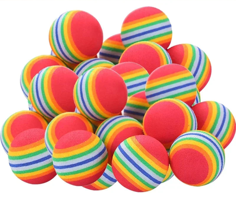 🎨 Färgglad regnbågsdesign – synliga och lätta att hitta 💨 Mjuk EVA-skumplast – säker och tyst på alla ytor 🎯 Studsande effekt – lockar till jakt och lek 🐾 Lättvikt – enkel att bära, kasta och rulla 👯 För självlek eller tillsammans med dig – idealisk för aktivering 📦 Finns i 10, 20 eller 30-pack – perfekt för hem med flera husdjur