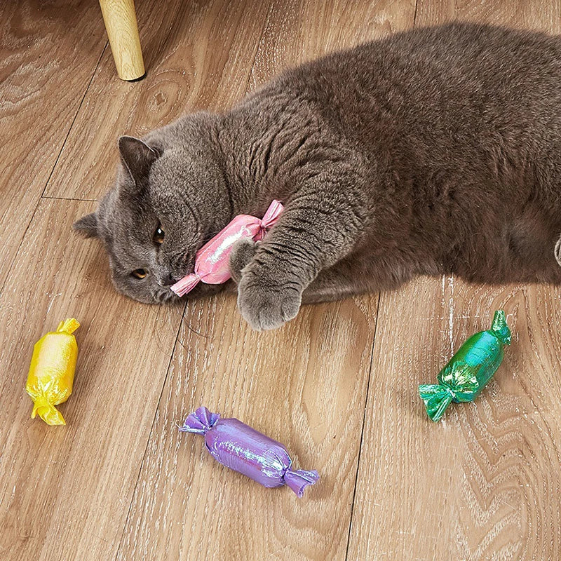 Dessa prasslande kattleksaker i godisform Àr bÄde roliga och funktionella! Den inbyggda prasselfilmen aktiverar kattens naturliga jaktinstinkt och bjuder in till lek, tugg, spark och kast. Perfekt för bÄde ensamlek och gemensam busstund.