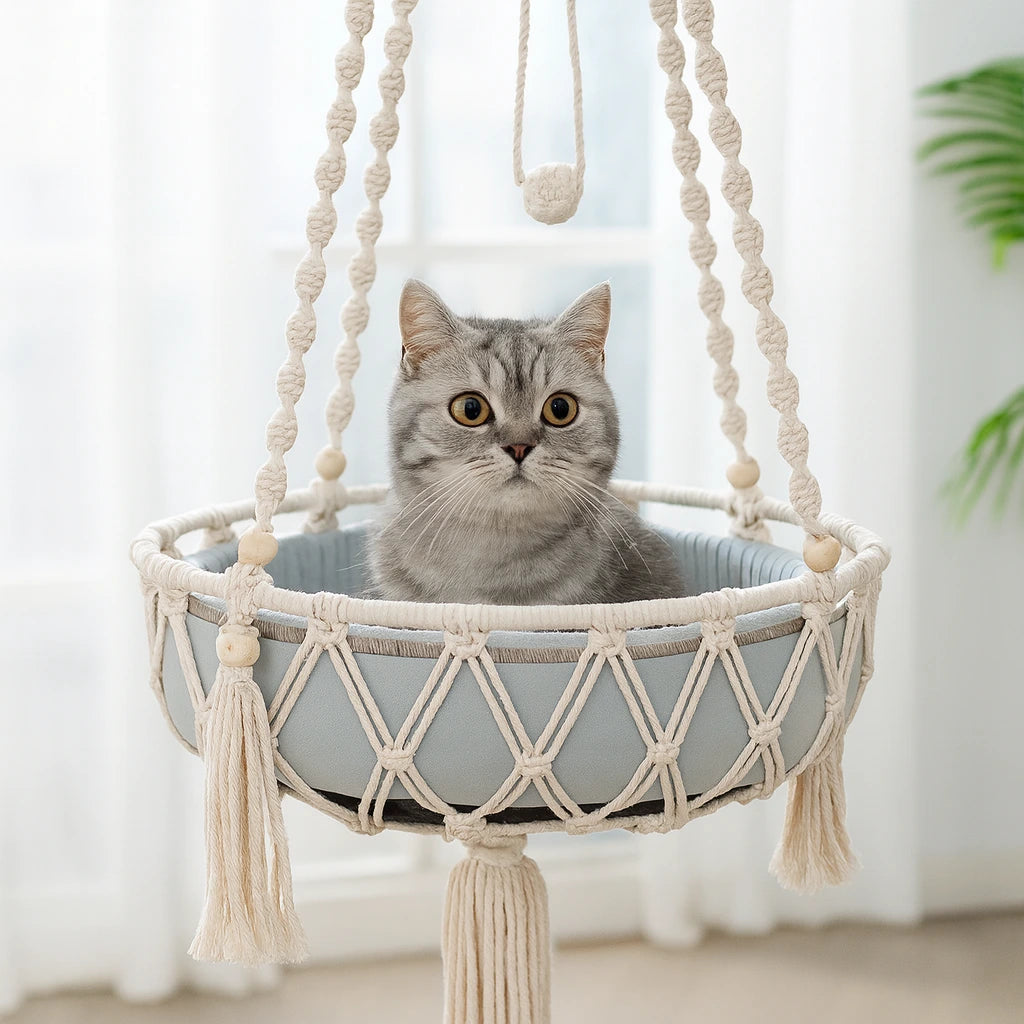 Ge din katt en stilren och mysig viloplats som svävar! Denna handvävda kattgunga i slitstark bomull fungerar både som hängmatta och sovplats. Hängs enkelt upp i taket eller på en krok och passar perfekt i alla moderna hem.