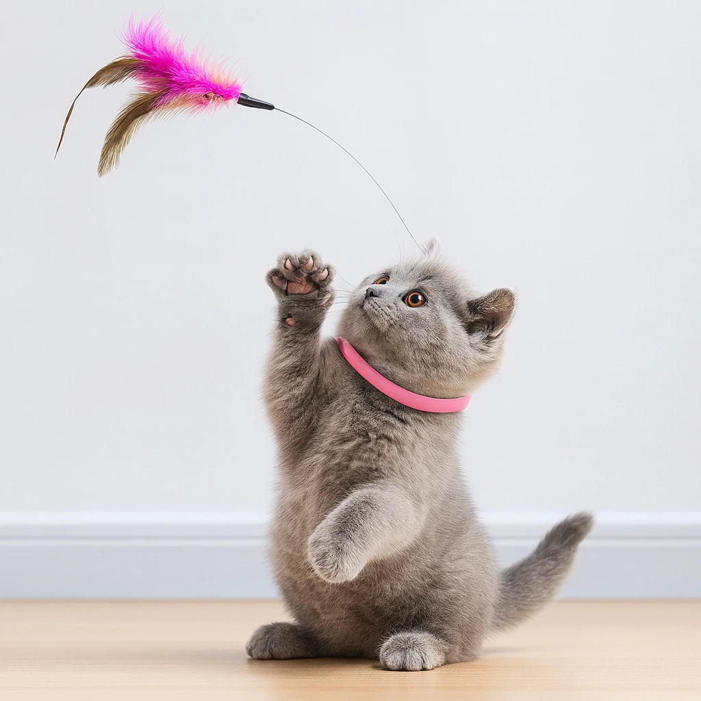 Ge din katt timmar av nöje utan att du behöver lyfta ett finger! Denna interaktiva kattkrage med fjäder är perfekt för självständig lek. Den sitter bekvämt runt halsen och låter fjädern med bjällra gunga och locka till jakt – precis som ett byte i rörelse.