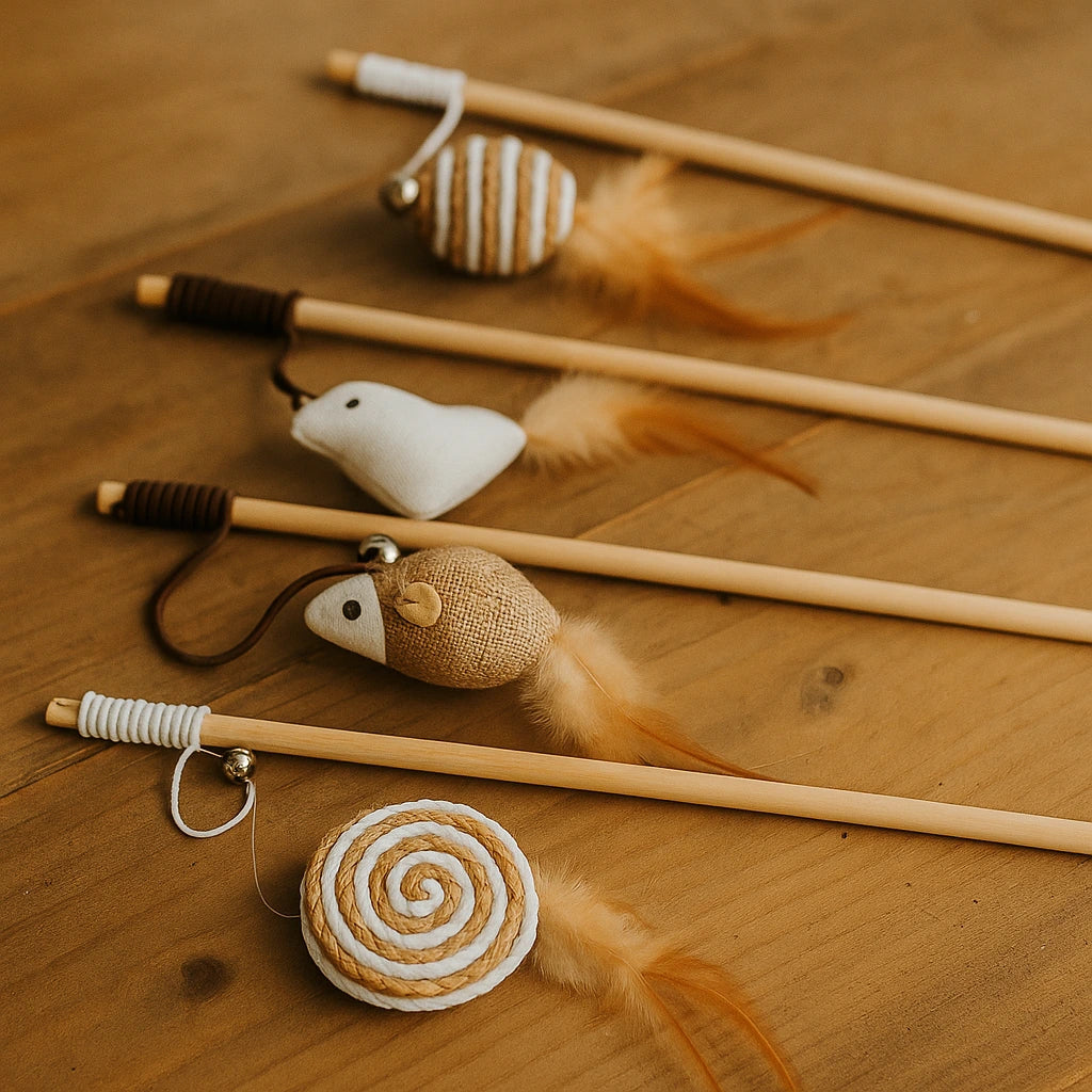 Fördelar: ✔️ Stimulerar kattens naturliga jaktbeteende ✔️ Handtag i trä – hållbart och greppvänligt ✔️ Fjäderleksak i olika former – variation som håller intresset uppe ✔️ Perfekt för lek mellan katt och ägare ✔️ Minskar tristess och inaktivitet