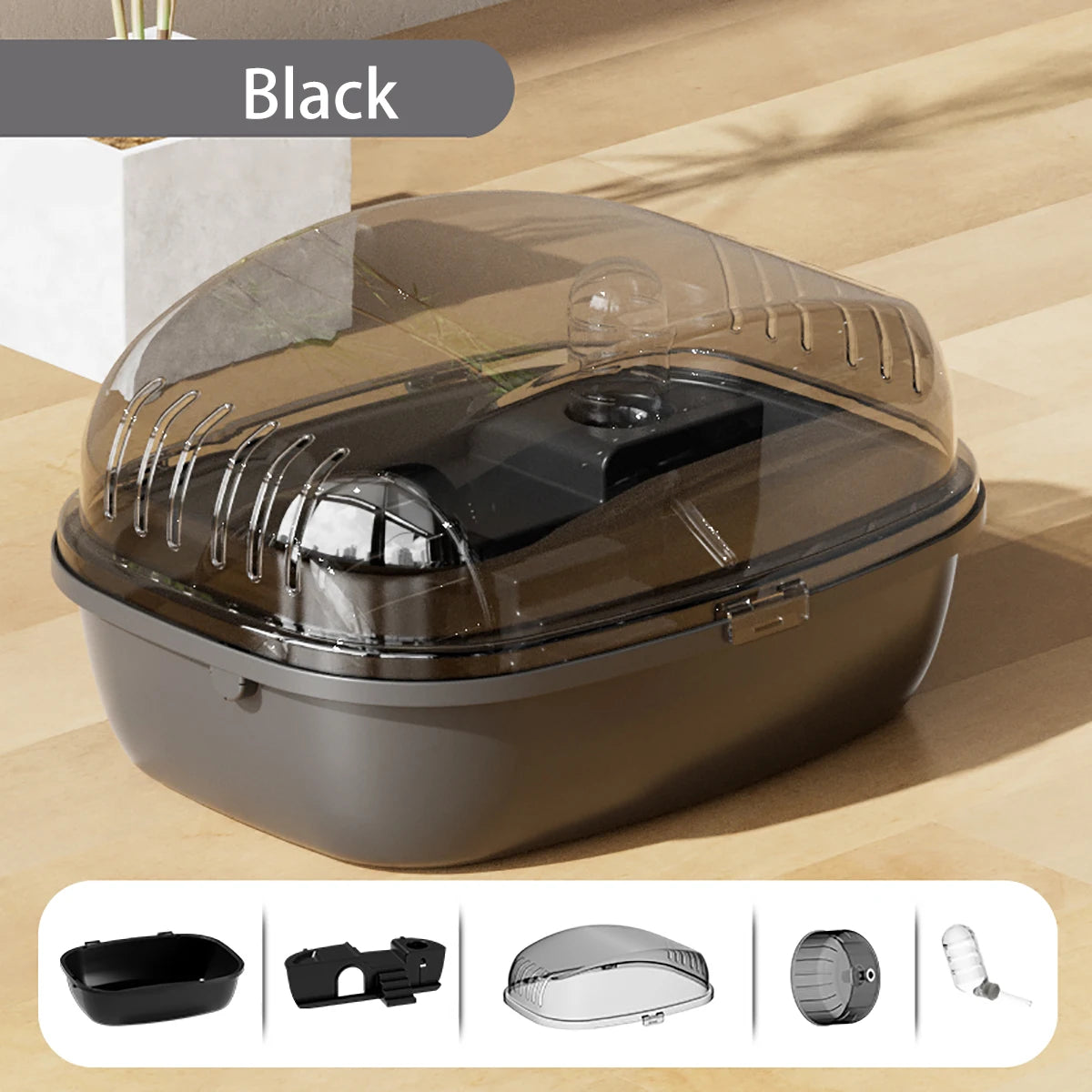 Inbyggt löphjul för daglig motion Mat- och vattenskål ingår Interiöra gångar, trappor och viloplatser Transparent kupoltak ger bra sikt och ventilation Passar hamster, mus, pygméigelkott, dvärghamster m.fl. Mått: 35,5 × 27,5 × 20 cm Färger: Rosa, Gul, Grå, Svart