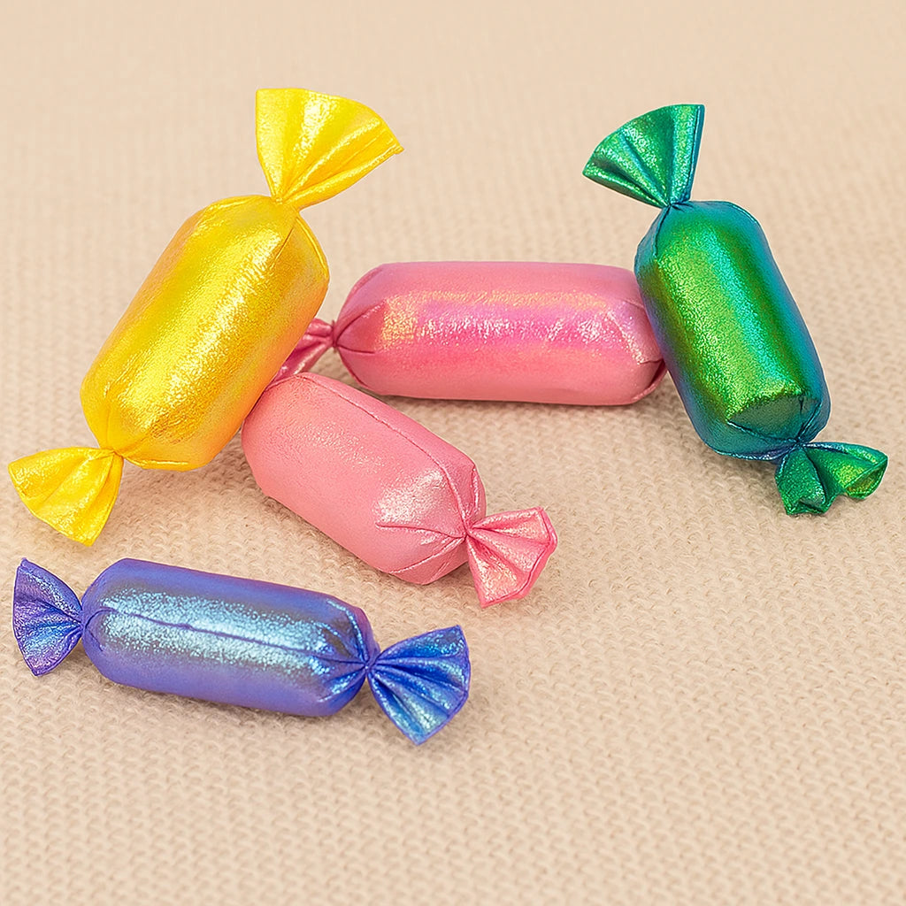 Dessa prasslande kattleksaker i godisform Àr bÄde roliga och funktionella! Den inbyggda prasselfilmen aktiverar kattens naturliga jaktinstinkt och bjuder in till lek, tugg, spark och kast. Perfekt för bÄde ensamlek och gemensam busstund.